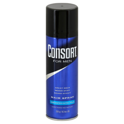 Do not use on broken skin. Great hold , never stiff & never sticky. 4.6 out of 5 stars with 23 ratings. Stop use if rash or irritation occurs. Consort for men hair spray, extra hold, aerosol unscented at walgreens. Consort for men hair spray unscented extra hold 8.30 oz (pack of 2) 4.6 out of 5 stars. Consort for men hair spray unscented extra hold 8.30 oz (pack of 2) 8.3 ounce (pack of 2) 4.7 out of 5 stars. Spend $20 get a $5 gift card on select beauty care items. $9.35$9.35 ($1.13/ounce) save more with subscribe & save. I don't like scented hair spray and this product has the least amount of smell of any product on the market. 99 ($1.08/ounce) get it as soon as wed, may 26. Great for regular guys who like to spend a lot of time outdoors but not a lot of time with a comb. Brylcreem brilliantly classic hair cream, 4.5 oz.